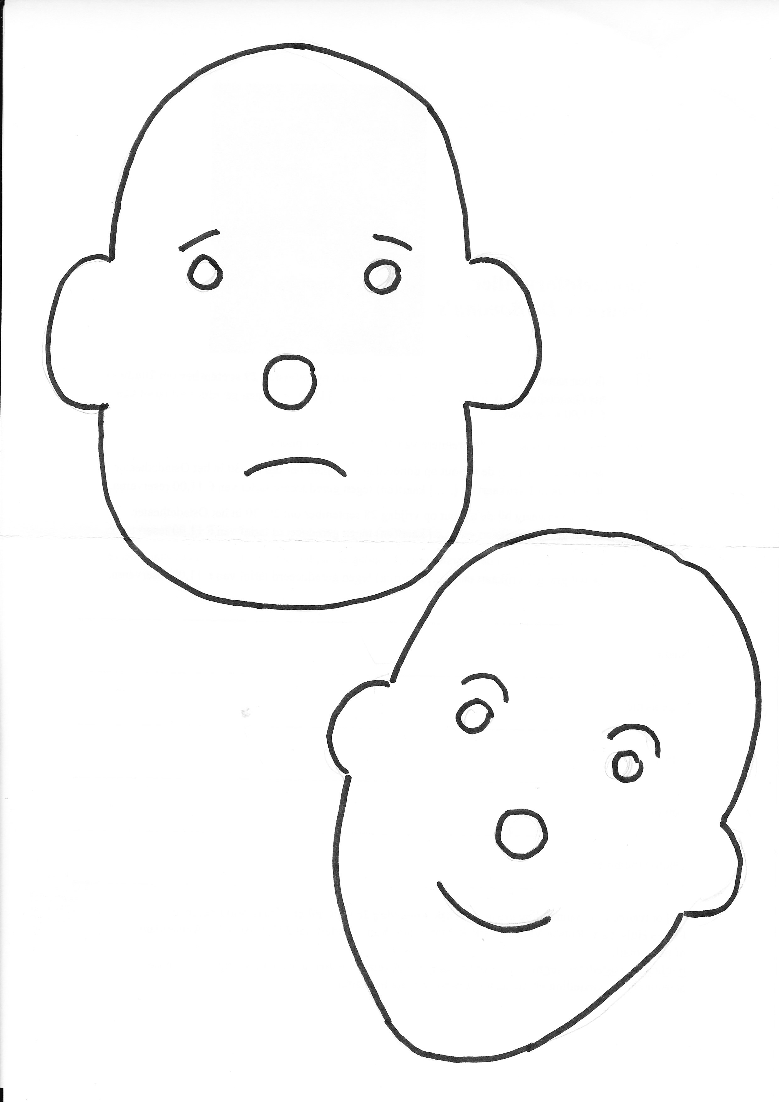 Knip het patroon uit en leg dit op het karton (even controleren, ze moeten ongeveer 15 cm hoog zijn). Knip uit en maak een gaatje zo dik als je vinger op de plaats van de neus (moet vrij strak zitten, anders steekt je vinger er te ver door en wordt het een heksenneus).