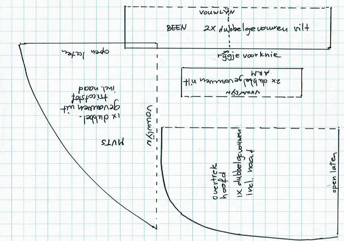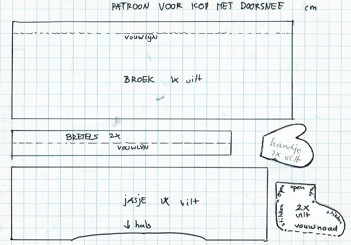 Plak het broekje langs de onderrand van het bekertje vast, over de beentjes heen. Naai de achterkant dicht. Naai de bretels dubbel (als dat nodig is). Bevestig deze pas, als de armpjes eraan zitten.