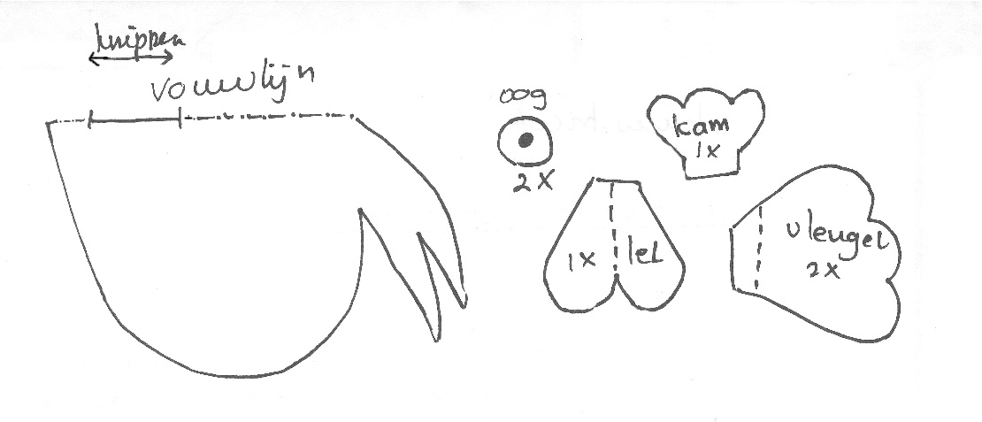 Vouw geel karton dubbel en knip de kippenvorm dubbel uit. Knip alle andere vormen uit. Knip de opening in de vouw van het kippenlijf zoals aangegeven en lijm daar de kam in. Lijm de rest op de kip. Plak de sate-prikker aan de binnenkant van het lijf en plak de andere lichaamskant ook op de prikker.